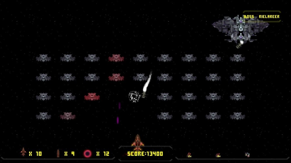 Задача простая - двигаться вперед, уничтожая судна враждебно настроенных пришельцев. Они формируют строй из боевых единиц различной мощности. Это могут быть как негабаритные истребители, так и массивные штурмовики, на разрушение которых не хватит одиночного залпа. Плюс ко всему, враги поливают геймера шквальным огнем из ракет и бластеров, поэтому важно постоянно маневрировать или постоянно стрелять, чтобы разрушить крупные снаряды. Иногда, формирования кораблей не достаточно плотные, поэтому сквозь них можно пролетать на скорости, не заморачиваясь на счет уничтожения. Кроме того, на уровнях разбросаны бонусные жизни.