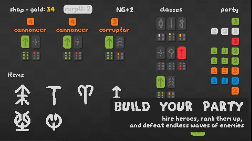 В тайтле минималистичная графика, поэтому члены отряда, что двигаются "паровозиком", внешне отличаются между собой только цветом кубика и проджектайлами. В игре 40 героев и такое же число предметов. Каждый персонаж обладает своими атакующими и пассивными умениями. Тут есть мечники, лучники, волшебники, разбойники, чумные доктора, артиллеристы и т. д. Всего здесь 12 таких специализаций. Представителей одной профессии можно объединять, чтобы разблокировать уникальные классовые способности. У продукта высокая реиграбельность за счет случайной генерации.