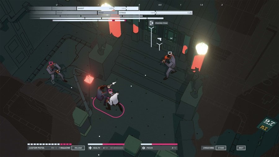 Каждое столкновение с многочисленным врагом происходит в пошаговом режиме на гексаобразной карте. Самое главное, необходимое для победы – правильно разработанная тактика ведения сражения и контроль показателя собранности, за счёт которого выполняются все действия. Джон славится своими умениями побеждать в неравных боях, теперь геймер должен ему помочь в этом. Нужно постоянно держать в уме тот факт, что в излюбленном оружии Уика всего 15 патронов, из-за чего нужно либо подбирать огнестрелы с убитых врагов, либо максимально экономить и не стрелять без крайней необходимости. Протагонист досконально знает восточные единоборства, что позволяет ему прекрасно себя чувствовать в контактном столкновении с недругами. На старте уровня, после фазы планирования, где геймер может просмотреть примерный план местности, локации покрыты "туманом войны", это серьёзно затрудняет ориентацию в пространстве и повышает шанс наткнутся на засаду.