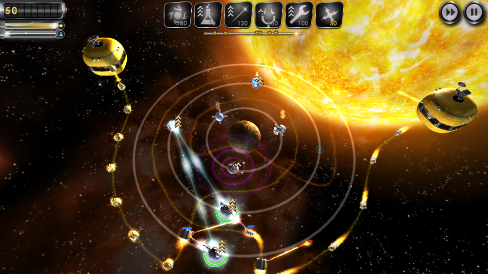 Ещё тут необходимо зарабатывать деньги. Можно ставить объекты, что ускоряют добычу этого ресурса. Валюта нужна для покупки и ремонта своих спутников. Ещё тут позволяют устанавливать специальную технику, что не атакует вражеских юнитов, а замедляет их. Кампания поделена на 40 уровней. Также в наличии таблица лидеров и отдельные испытания. Помимо этого имеется режим выживания.