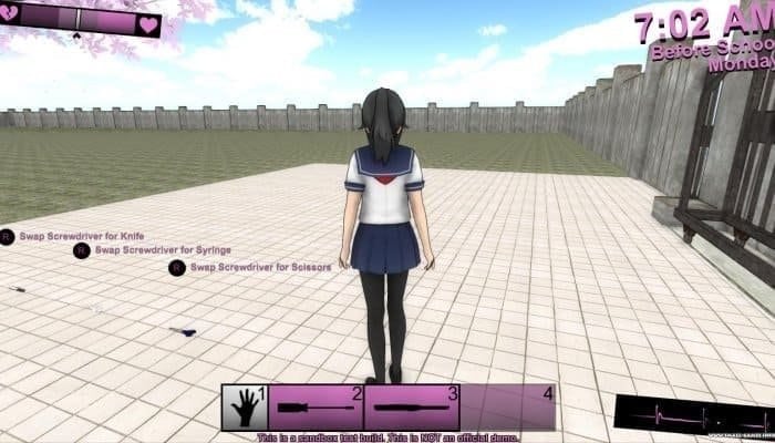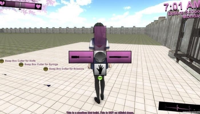 У вас есть пару дней, чтобы придумать план устранения, следя за девочками, определяя их слабые места. Вариантов много – затравить социальным саботажем или шантажировать, решить всё мирно и полюбовно или пойти на крайние меры – убийство. Если вы сделаете это, у персонажа упадёт уровень вменяемости, влияющий на прохождение. Пополнить шкалу можно посмеявшись (эмоциональная разрядка – механика игры) или подойдя к Ямаду, только не попадайтесь ему на глаза.