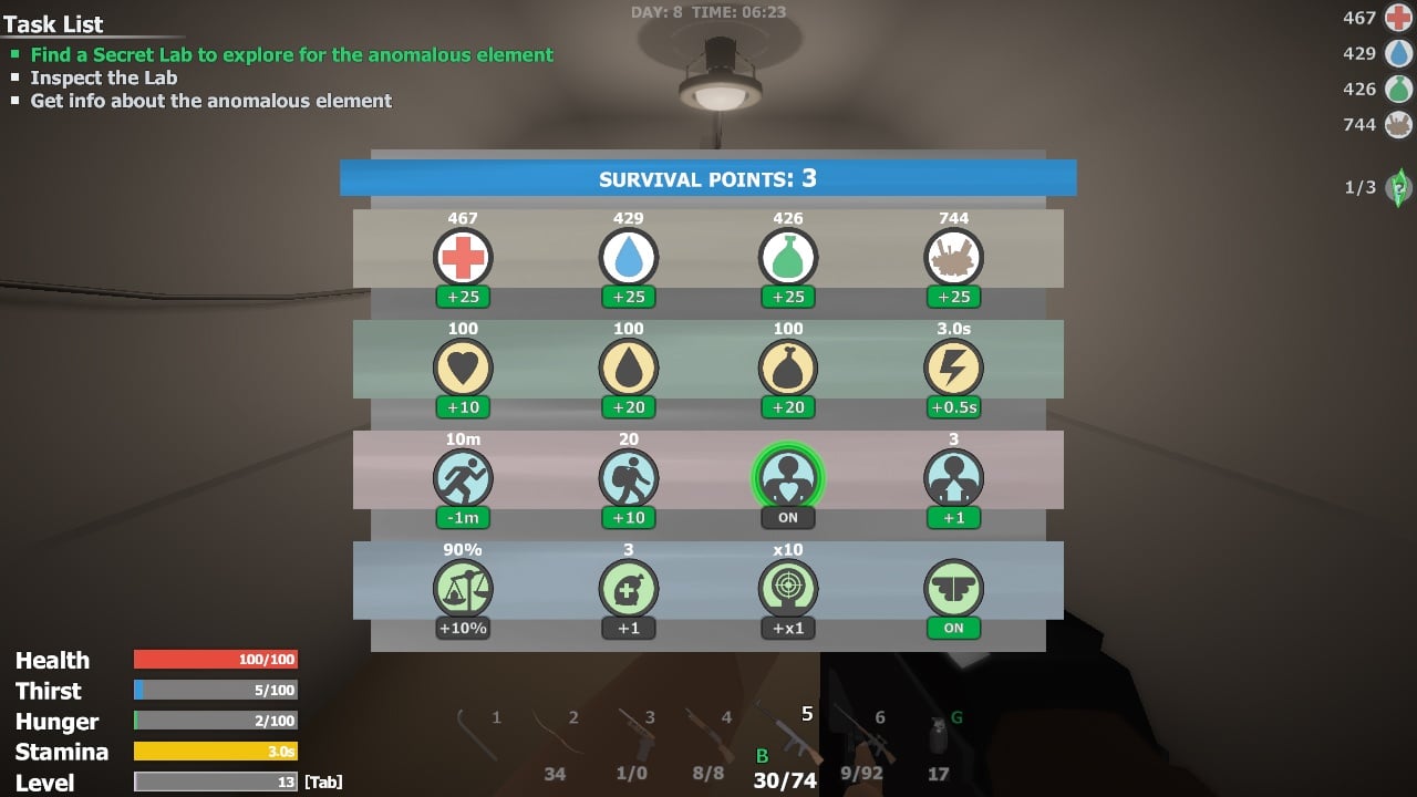 Предстоит заботиться о жизненных показателях персонажа: жажда, голод, строчка здоровья и энергия. Зараженные сбегаются на громкие звуки, либо как учуют человека. Нанимайте и контролируйте других выживших с уникальной характеристикой. Они также собирают ресурсы и сражаются с соперниками. В лабораториях, военных или секретных базах больше всего оппонентов, но и добыча выше.