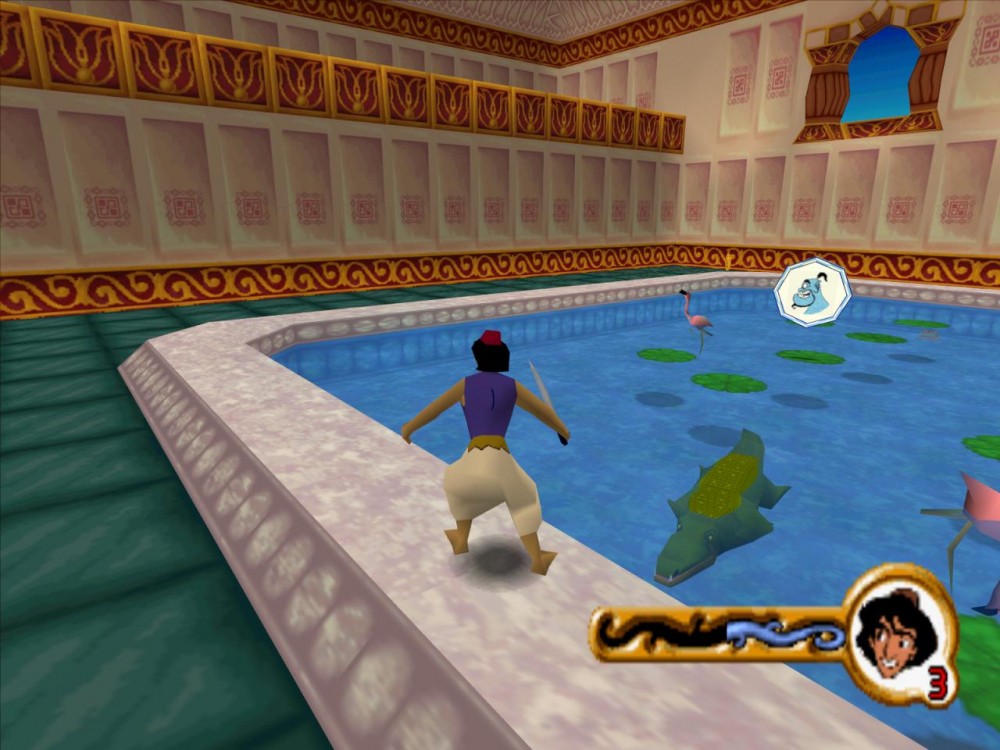 Стартует прохождение с ознакомительных видеовставок, что дают понимание происходящего игроку, что не знаком с оригиналом. Вся кампания разделена на множество отдельных локаций (улицы, дворец, темница, пирамида, логово Назиры, Оазис и так далее), большинство из которых полностью линейны. Во время прохождения можно отыскать громадное количество персонажей, что помогут главному герою за выполнение определённой просьбы. Также, локации полны противниками, что готовы убить виртуального протеже практически в любую секунду. Бои с ними происходят при помощи меча, если этап проходиться за Аладдина. Имеются два других играбельных персонажа: Абу и Жасмин. Оба они не обладают холодным оружием, обезьяна умеет бросать предметы для нанесения ущерба.