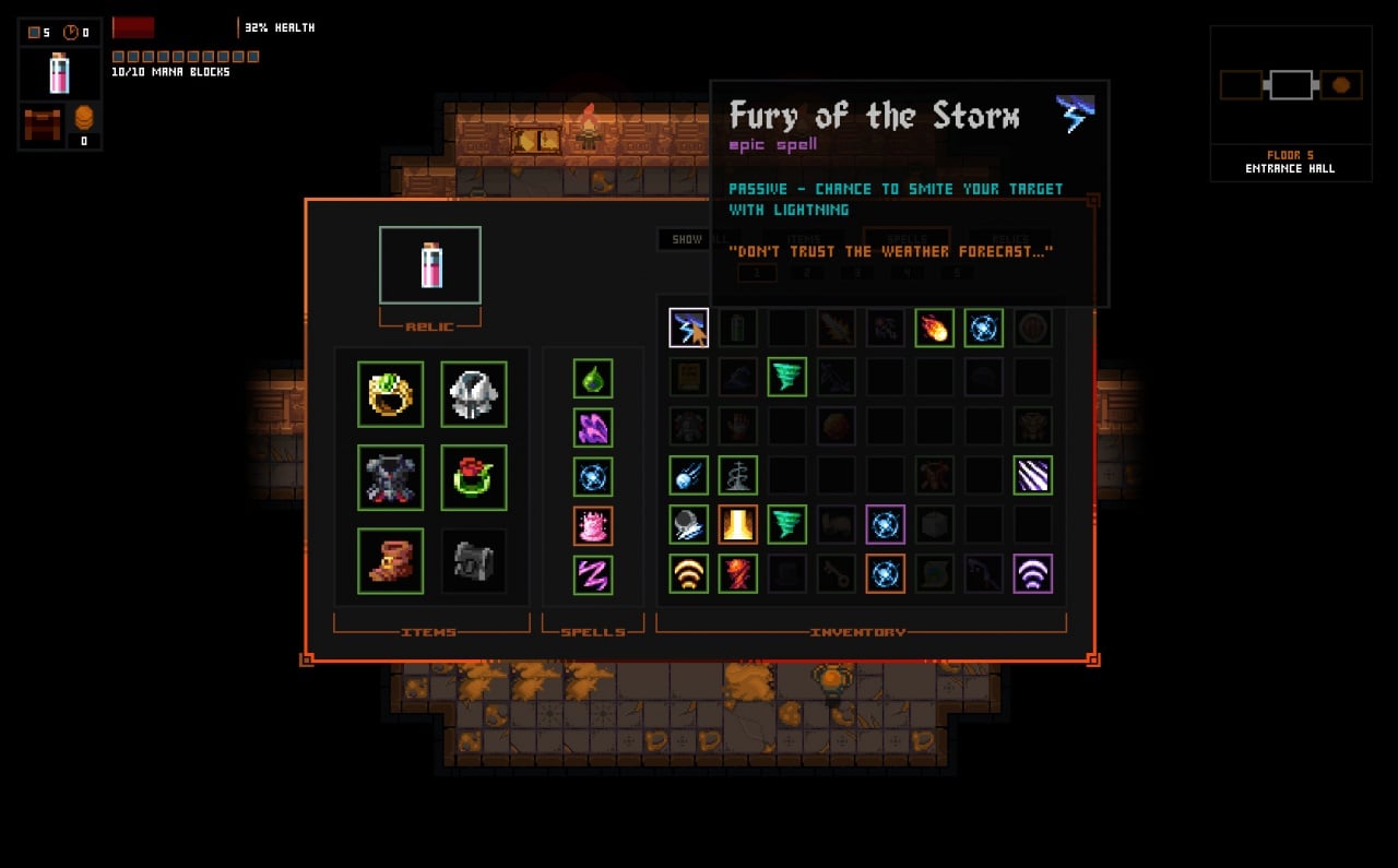 Билды строятся на ходу, а инвентарь полностью меняется в течение часа игрового процесса. Благодаря 200+ предметам, вы найдете любимый стиль прохождения. Сила магии модифицирует атаки последнего выжившего колдуна. Фаерболы, заморозка, станы, моментальный урон, град стрел и многое другое применяет персонаж за считанные секунды. Одновременно используются 5 или меньше томов заклинаний, способности которых комбинируются, добавляя новые эффекты.