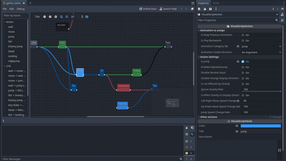Вся магия в визуальном редакторе: вместо того чтобы писать строчки кода, ты просто соединяешь блоки-"Действия" как конструктор. Нажал кнопку - персонаж прыгает, столкнулся с врагом - теряешь жизнь. Все наглядно и понятно. Идеально для быстрых экспериментов, когда хочется проверить идею, не тратя недели на изучение языков программирования. Правда, если вдруг захочется чего-то более хитрого, можно подключить GDScript.
