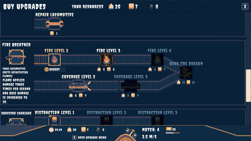 Геймплей требует тактических решений на каждом перекрёстке: выбираете между тремя маршрутами, отличающимися плотностью врагов и количеством ценных материалов. Сбор ресурсов автоматизирован через дрона, так что фокусируетесь на бою. Улучшений масса: устанавливаете новое вооружение вроде энергетической пушки Blaster с огненным следом, меняете локомотивы на более мощные типа DRB Class 01.10. Прокачка идёт через дерево технологий, где платите сталью, золотом и спасёнными людьми.