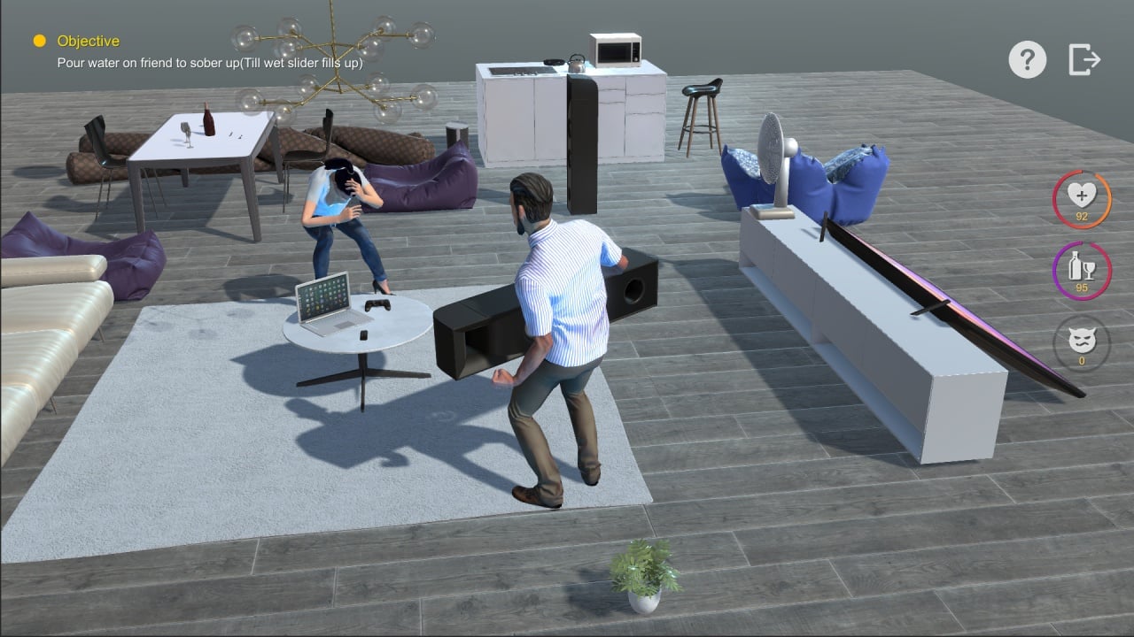 Благодаря обученному искусственному интеллекту, пользователь никогда не будет знать о том, что взбредёт в голову пьянице в ближайший момент. Молниеносная реакция на изменившиеся условия становится основополагающей в успешном прохождении однопользовательской кампании. С помощью отдельной моделяции каждого объекта окружения, геймер может взаимодействовать с любым предметом на представленной локации и применять в различных ситуациях ради веселья или для попытки подобрать правильное решение головоломки, связанной с успокаиванием грубых любителей танцев под действием крепкого алкоголя.