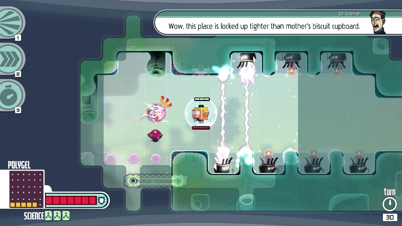 По мере прохождения судно научится перемещаться через один квадрат и оглушать противников бомбами. В Nova-111 использование способностей тратит заряды науки. Эту шкалу и полоску здоровья можно увеличить, если искать апгрейды в секретных местах. Для открытия самих скиллов нужно собирать на локациях пропавших научных сотрудников.