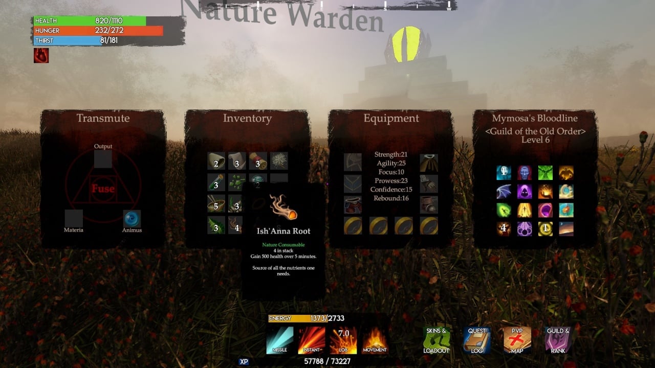Каждый юзер обладает 4 ячейками для активных заклинаний. Магия делится на 6 элементов. У персонажей прокачивается сила, ловкость, фокусировка, доблесть, уверенность и увертливость. Герой может носить обувь, штаны, рубашку, головной убор, перчатки, накидку и четыре кольца. В проекте есть элементы выживания и крафт. Абсолютно все предметы можно переработать в более полезные вещи посредством трансмутации.