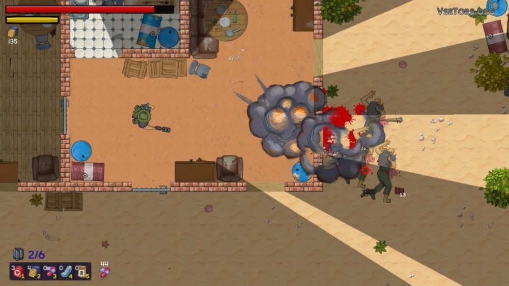 Геймплей представлен в виде экшена с видом сверху и двумерной графикой. Во время сражений прольется много крови, а противникам можно отсекать или отстреливать разные части тела. Прицеливание происходит при помощи красной метки. Если соперник направился на подопечного, то попадание всегда будет в голову. Представлен проработанный искусственный интеллект, управляющий врагами. Они нападают вместе, с разных сторон, стараются уворачиваться от выстрелов и атак главного героя.