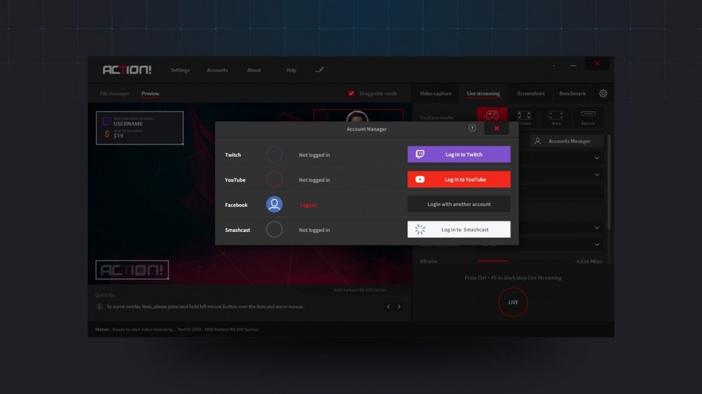 У Action! - Gameplay Recording and Streaming простой и понятный интерфейс. При этом второй монитор не обязателен, так как здесь есть экранный HUD и поддержка оверлеев, в том числе и в браузере. Это позволяет видеть чат, уведомления и другие элементы, а также добавлять поверх изображения графику или свой логотип. Программное обеспечение позволяет делать прямую трансляцию видеоигр на Twitch, YouTube и другие популярные платформы. В этой программе можно накладывать эффекты, вроде замедления, делать превью, предварительно просматривать готовящийся видеоролик и писать к нему закадровый голос ("живой" комментарий).