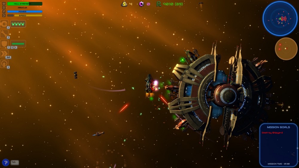 Юзер наблюдает за происходящим с видом сверху, а местность представлена в трехмерном стиле. В окружении существует множество объектов, подвергающихся взаимодействию. К примеру, летающие астероиды или обломки могут нанести повреждения при столкновении. Вражеские снаряды, большая часть из которых лазеры, долетают до цели не моментально. Это позволяет уворачиваться от атак, применяя скорость своего корабля.
