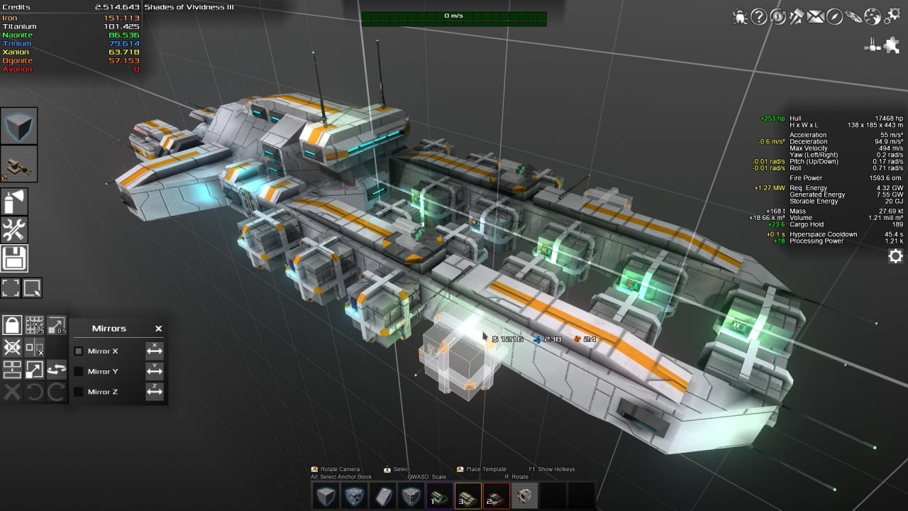 Но что вы точно будете делать в любом из этих случаев - так это создавать корабль. И вот здесь разработчики выложились на полную. Avorion предлагает весьма продвинутый конструктор кораблей, где у вас в начале есть лишь основа корабля. Всё остальное вы создаёте сами. Вы сами размещаете жилые отсеки, энергоячейки, бойницы и точки для турелей, ракетные установки, генераторы кислорода, бронеэлементы и солнечные панели. И у каждого блока есть свои характеристики, в зависимости от того, какой материал вы применяете.