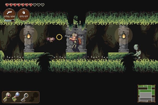 Амуниция выпадает из убитых врагов. По мере прохождения можно отыскать апгрейды, увеличивающие размер обоймы. Также молодой человек обзаведется гранатами, что не только наносят урон противникам, но и помогают взрывать некоторые стены. За ними всегда находится какой-то полезный секрет. Мир в инди-проекте частично открытый. Подземелья можно исследовать свободно до тех пор, пока герой не наткнется на препятствия. После этого надо будет отыскать ключ нужного типа или получить новую способность (двойной прыжок, удар клинком, подкат и всё в таком духе), чтобы пройти дальше. Присутствует возможность увеличить размер здоровья.