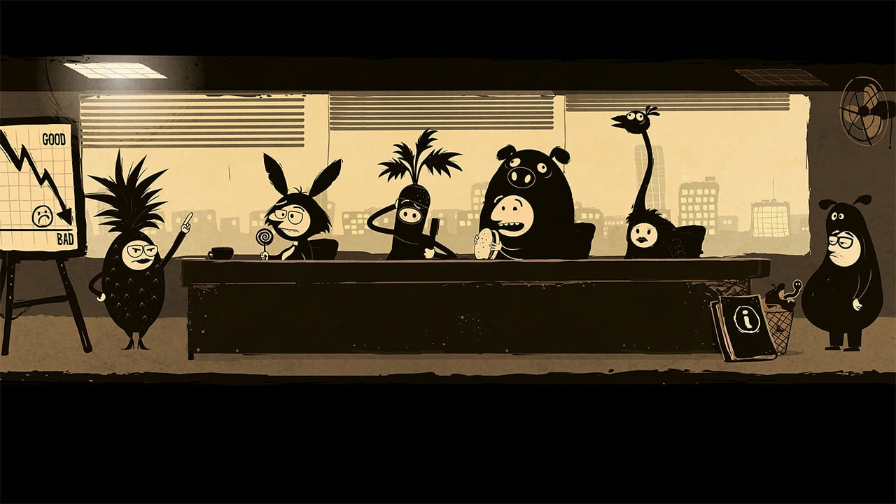Под управление дают служащего компании, что ежедневно нажимает одну и ту же кнопку. По сюжету он устал от однообразия и решил сбежать с тоскливой работы. Герой общается с NPC на тарабарщине. Примерный смысл местной речи подается с помощью иллюстраций. Классических текстовых диалогов нет.