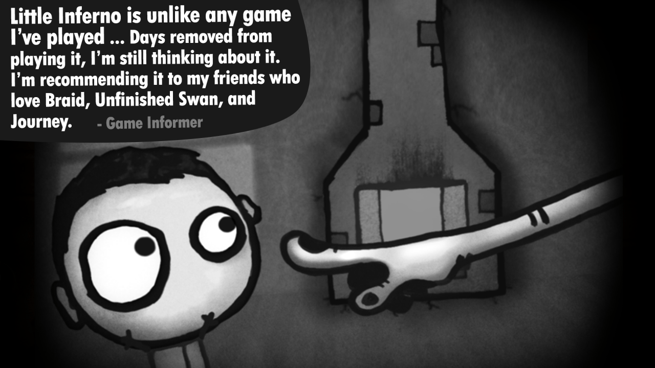 Сжигать вещи необходимо из-за того, что в помещении все время падает температура. Поэтому Маленькое Пекло в первую очередь содержит элементы выживастика. Сжигая предметы, выдается денежная компенсация. Их можно тратить на заказ новых вещей из каталога заказов. Особых рамок или таймеров в Little Inferno нет.Позволяется экспериментировать с комбинациями, чтобы изучить взаимодействие и влияние друг на друга предметов в камине.