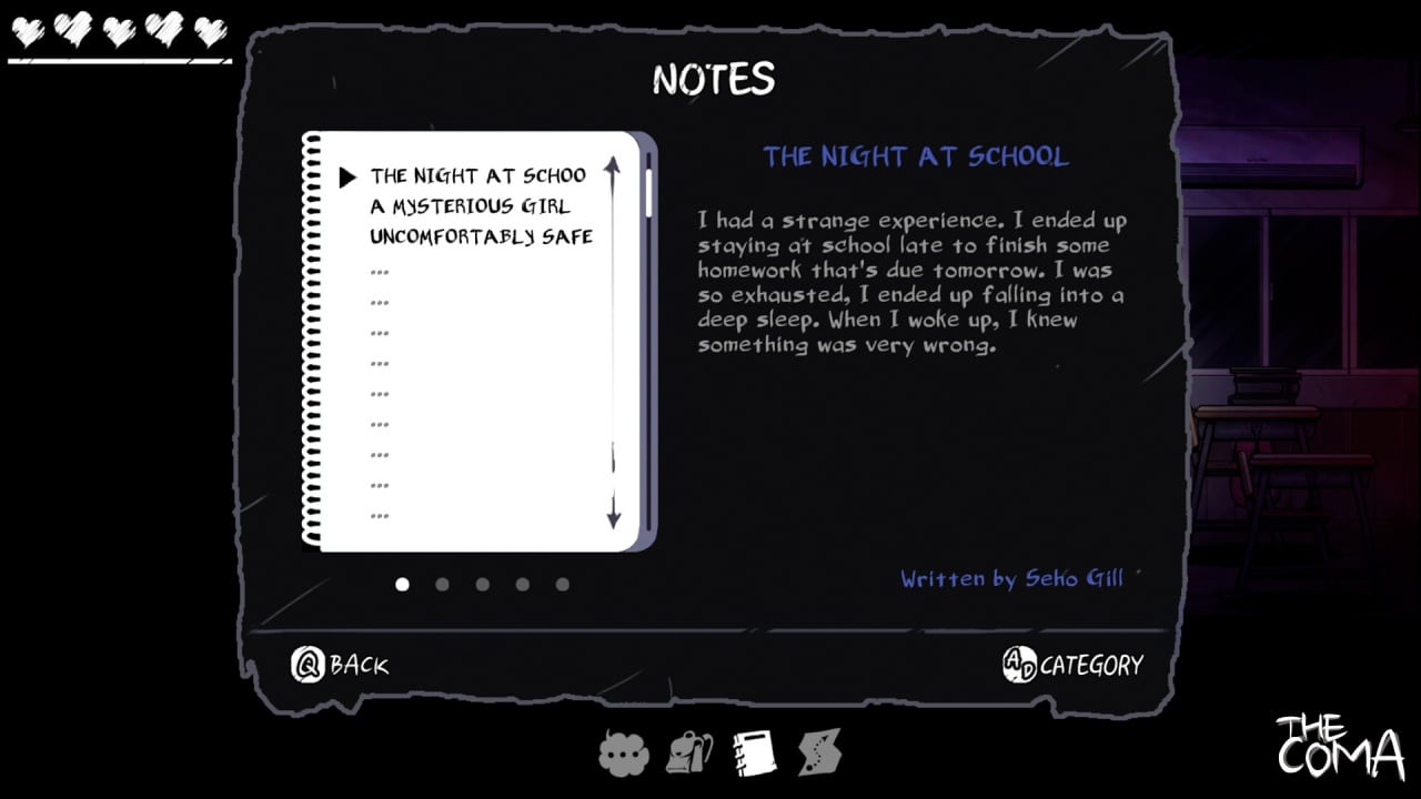 Геймплей: вам предстоит исследовать здание в поисках различных зацепок, припасов и ключей, дабы открыть кабинет, в котором лежит нужная информация или другой полезный лут. В игре всего три больших корпуса. Периодически вам на пути будут встречаться полезные персонажи. В The Coma присутствуют враги, которые будут поджидать вас где угодно. От них можно уклоняться с помощью перекатов, или сделать так, чтобы вас потеряли из виду. Чтобы избежать стычек, передвигайтесь скрытно и прислушивайтесь к шагам.