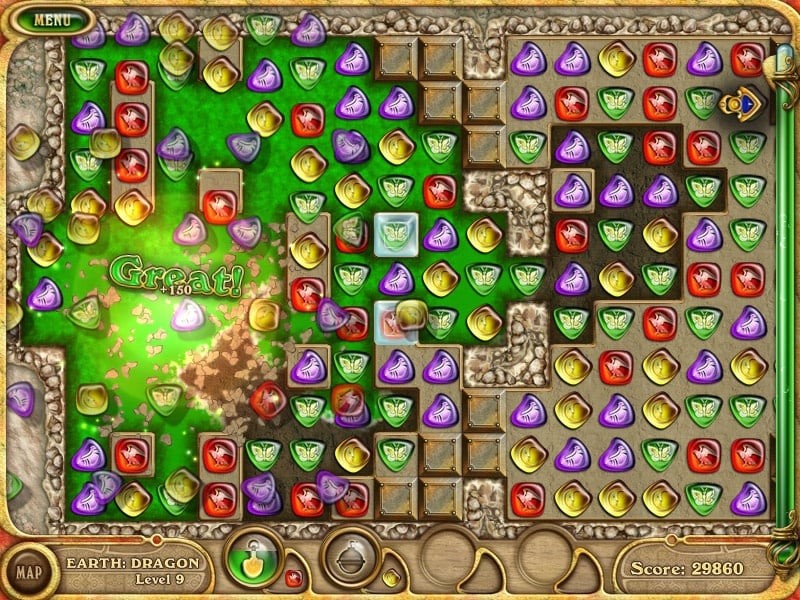 Чтобы решить проблему со стихиями, нужно получить доступ к четырем книгам. Чтобы добраться до каждой из них, необходимо преодолеть 16 уровней. Правила привычны для этого жанра: требуется составлять максимально длинные последовательности из разноцветных камней, меняя их местами. Есть интересная особенность: нужно не просто закликать все поле, а провести поток воды из одного конца экрана в другой. К тому же, есть ограничение по времени.
