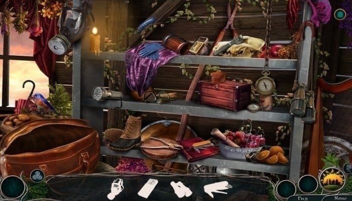Поиск предметов для решения ребусов силуэтный и по списку. Некоторые предметы помечены метками "+" и " - ", дающими подсказку, требуется ли сейчас провести с предметом какое-либо действие (разобрать, соединить с другим предметом, рассмотреть).
