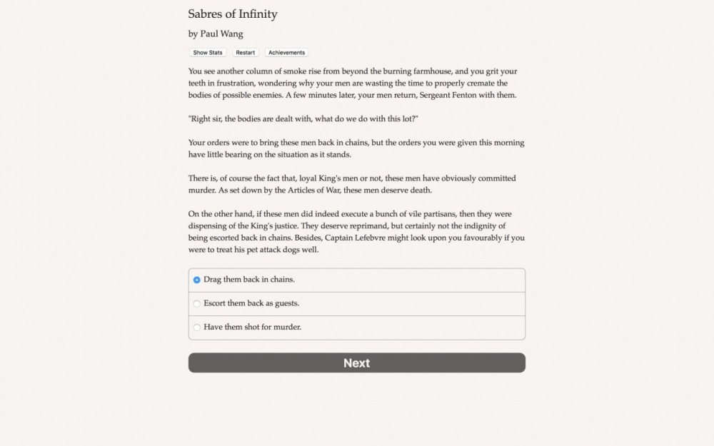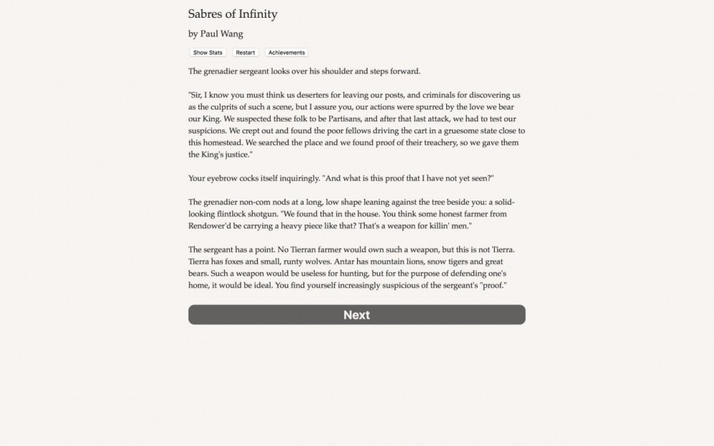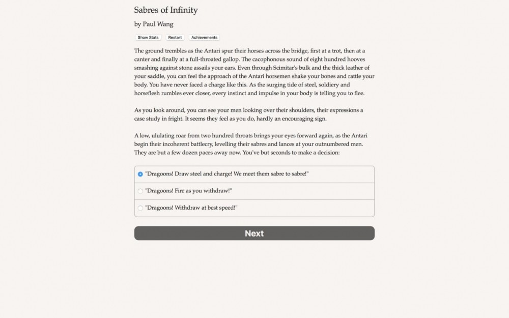 Sabres of Infinity – это интерактивная книга и по совместительству текстовая адвенчура. В ней практически нет графики. Представление о мире формируется через словесные описания. Порой юзеру дают совершить выбор, и иногда действия влияют на повествование. Но пользователь тут чаще является пассивным наблюдателем, чем активным участником событий. Это первый эпизод саги.