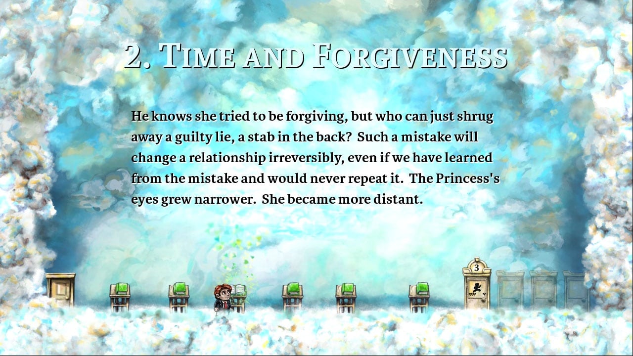 Пока вы решаете логическую задачку, то сможете понять, что все они собраны из разных миров. Ваша задача — пуститься путешествовать по другим мирам, помочь игроку отыскать скрижали других головоломок и всё-таки найти принцессу, которая вообще является приятным бонусом, но никак не смыслом.