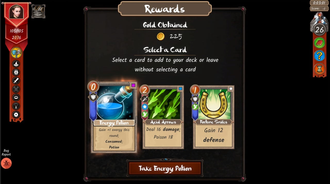 Атакующая категория представлена такими картами, как Poison, Burn, Frost, Expose, Bleed и Shock. Игра содержит несложную ролевую систему. Можно заниматься отваром различных зелий. Наиболее эффективные необходимо брать с собой в бой. Но стоит учесть, что инвентарь не бесконечный, поэтому требуется тщательно подбирать самые лучшие вспомогательные предметы. Карты могут получить как длительное, так и временное улучшение. По мере прохождения, будут доступны новые классы, карты, экипировка, события и монстры. Помимо кампании присутствует еще два режима: Испытания и Одиссея.