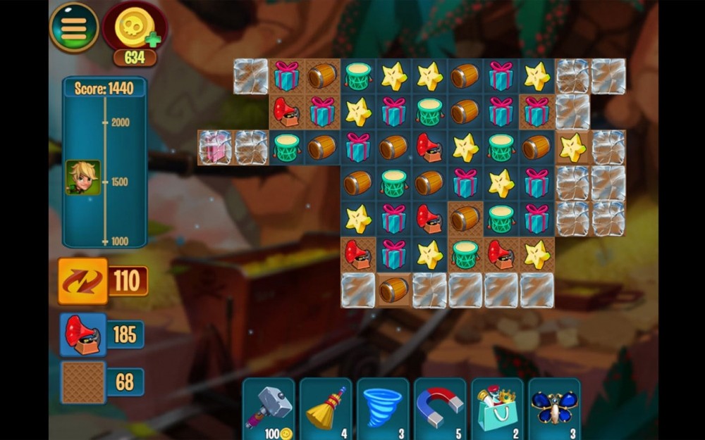 Всего здесь несколько режимов, каждый из которых ставит разные задачи. Это может быть набор определенного количества балов, сбор предметов (нужно просто выбить их в нужном количестве), убрать вещи, закрытые плитами или собрать элементы одного цвета. На каждом уровне имеется счетчик ходов. В начале, на него не обращают внимания, но потом за подобным приходится следить, так как цели становятся труднодостижимыми. Если не удалось завершить миссию с предоставленным количеством движений, можно докупить их, потратив золотые монеты. А в целом, Neverland Treasure достаточно проста в освоении и подойдет для приятного времяпровождения.