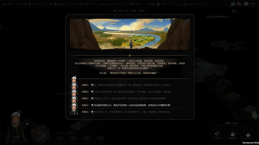 У персонажей есть очки действий, которые нужны для посещения локаций и сбора ресурсов. Когда запас очков потрачен, начинается новый месяц, где происходят события, основанные на прошлых выборах и близком окружении. Способности в The Scroll of Taiwu делятся на 2 типа: боевые и жизненные. Для их прокачки доступны книги, также есть 15 фракций, где можно изучать другие навыки. Чтобы разблокировать умение, нужно обладать достаточным уровнем поддержки членов соответствующей фракции. У героев есть характер, который влияет на результат определенных действий и исход приключений. Можно встать на путь справедливого добряка, эгоиста или мятежника. Но если персонаж будет выбирать действие, противоречащее его качествам, то может впасть в депрессию или поменять личность.