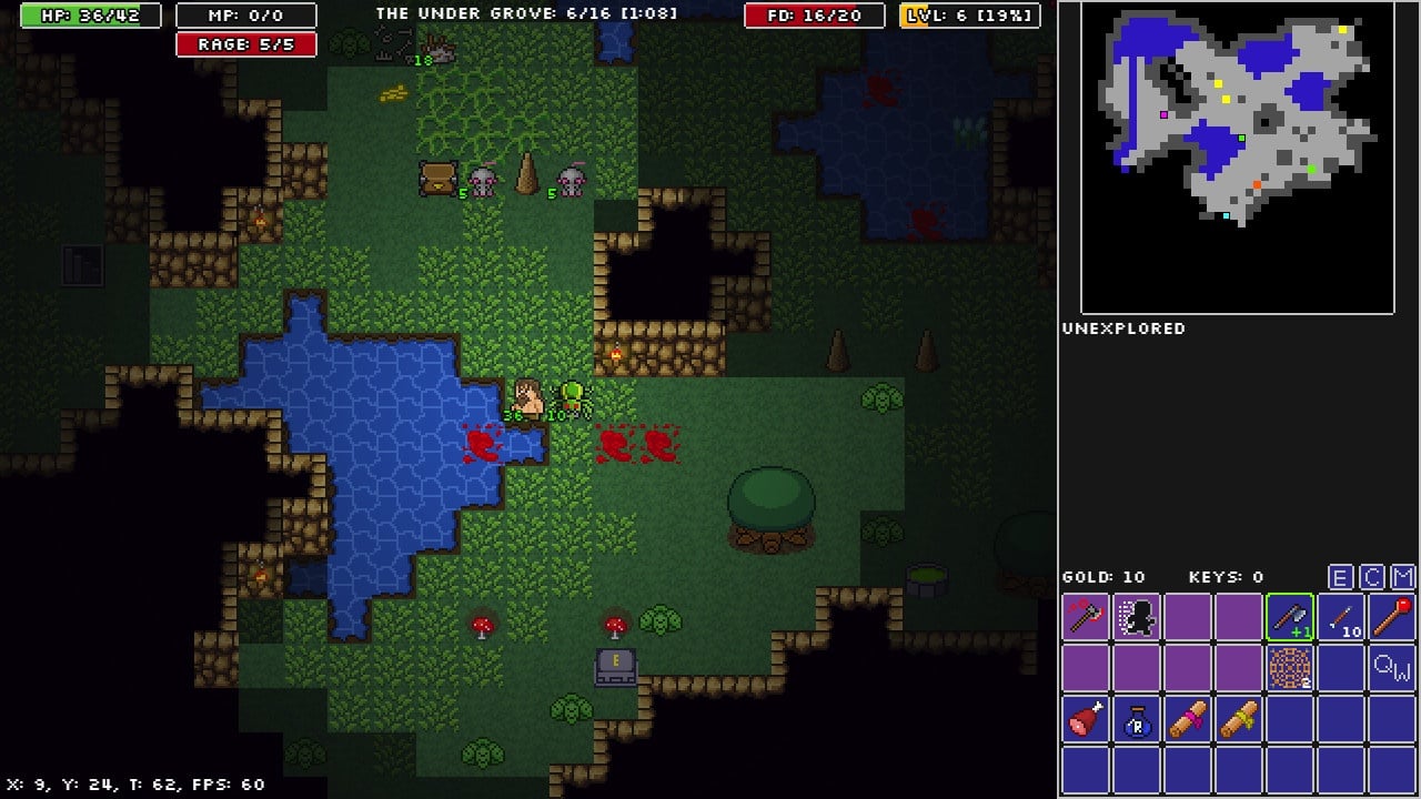 В игре 7 рас и 10 классов, каждый из которых может пользоваться и чужими навыками с предметами, если найдет их. Проект позволяет менять билд героя и порой даже вынуждает делать это. Можно начать игру за варвара и переквалифицироваться в мага, потому что авантюрист внезапно не сможет отыскать приличных мечей с топорами, но зато найдет крутой огненный посох. Подобные моменты зависят от везения. Всего тут 150 типов вещей, а умений – 60. Сами данжи тоже разнообразные. Есть 13 биомов: подземные болота, вулкан, склеп и т. п.