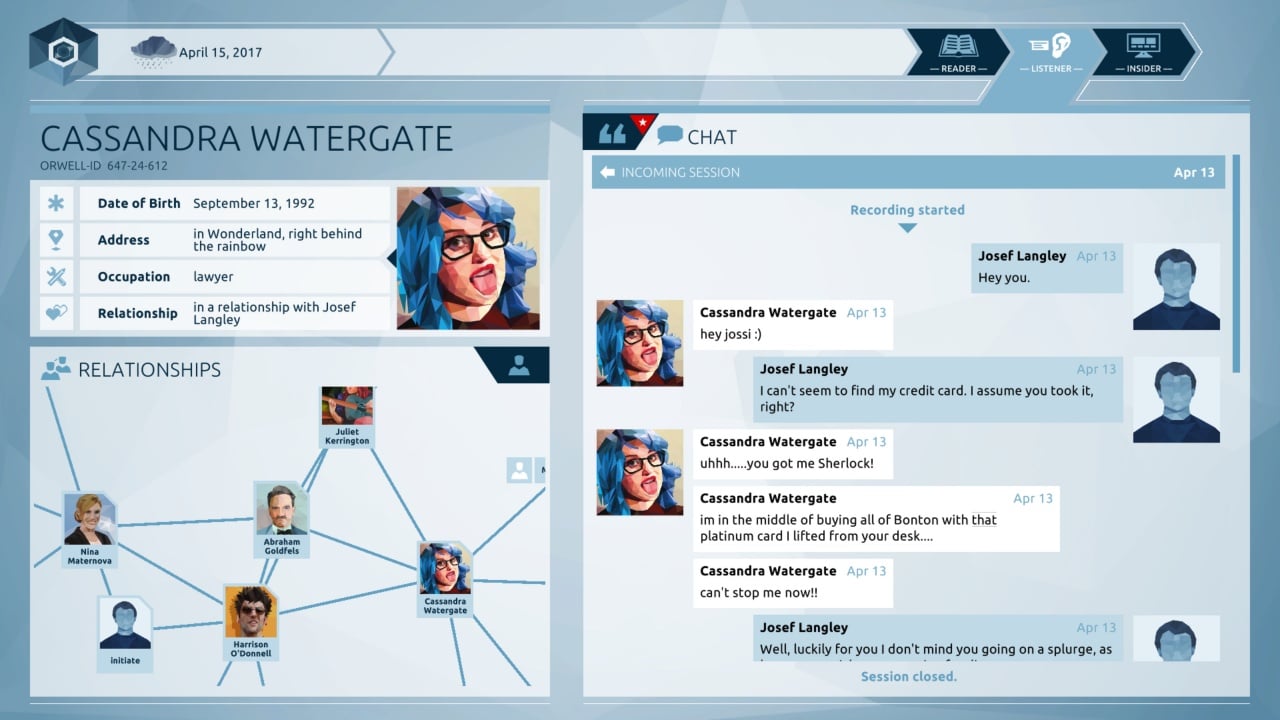Возьмите управление над человеком-расследователем, и получите доступ к системе Orwell. Благодаря данной программе вы способны читать любые переписки, прослушивать звонки, искать скрытные сведения о любом человеке, изучать портфолио или находить важную информацию. Главной задачей является обнаружение тех самых преступников, создавших массовый взрыв.