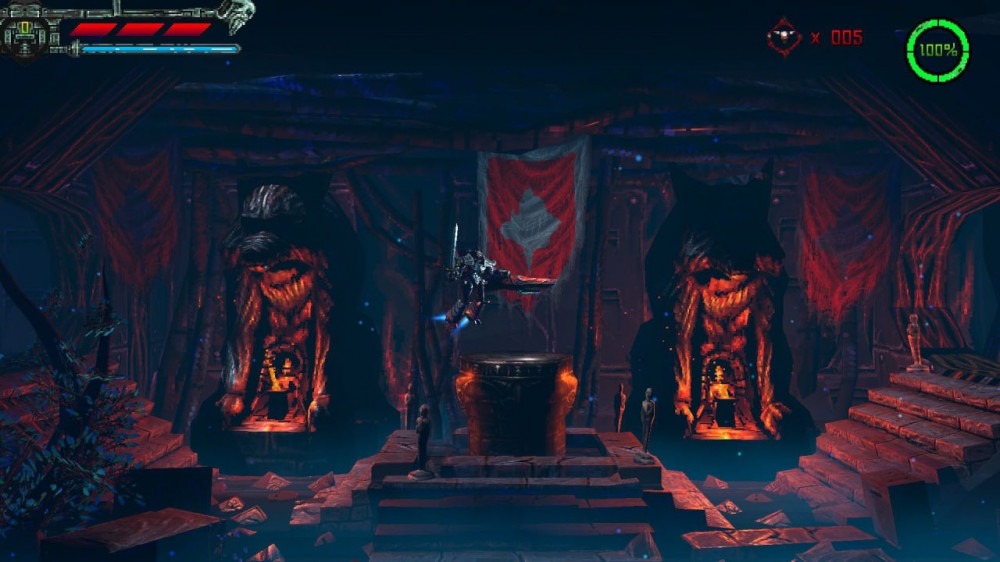 В Вальфарис: Меха-Терион перекочевали некоторые смертоносные предметы из предыдущей видеоигры. К примеру, здесь есть Адский Гнев, Неборазлом, Мучитель. Присутствует тут и другой арсенал. Вооружение делится на 3 типа. Оно бывает разрушительным, баллистическим и рукопашным. Пушки и клинки разрешают комбинировать. Чтобы ими обзавестись, нужно собирать Кровавый металл. Этот ресурс также позволяет устанавливать на доспехи различные апгрейды. Главный персонаж путешествует по инопланетным мирам, уничтожая на ходу препятствия и враждебных пришельцев. Периодически ему на пути попадаются боссы. Схватки с врагами сопровождаются брызгами крови.