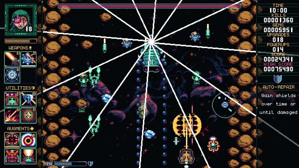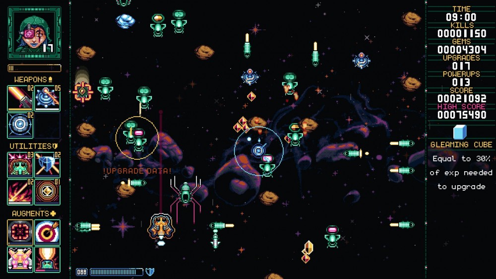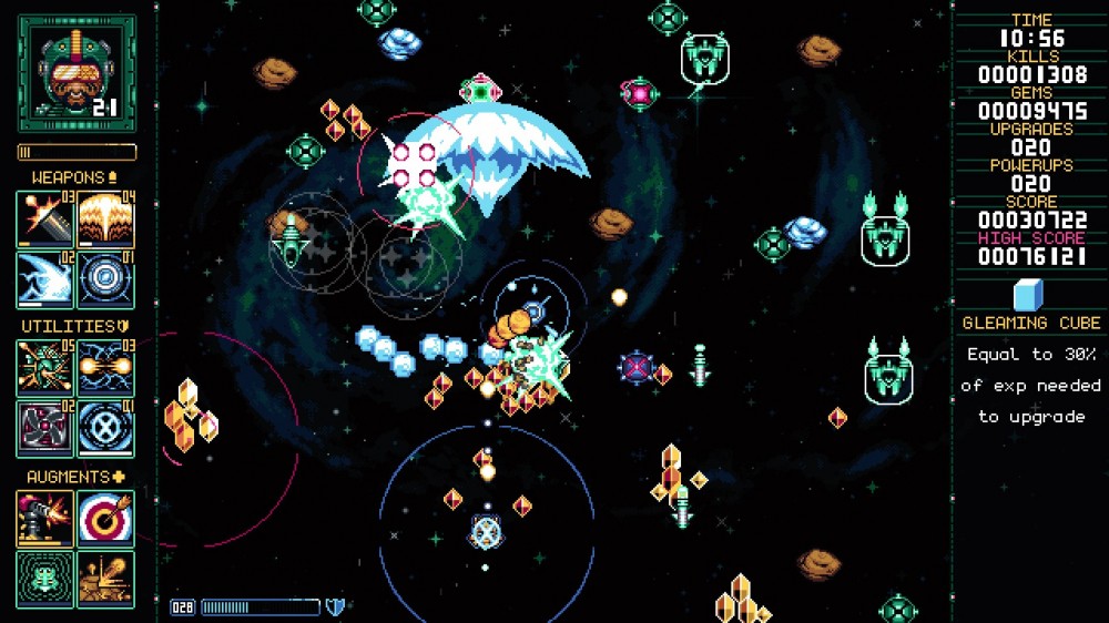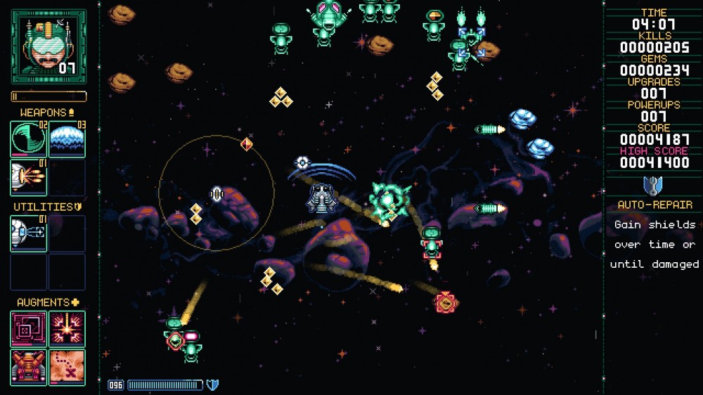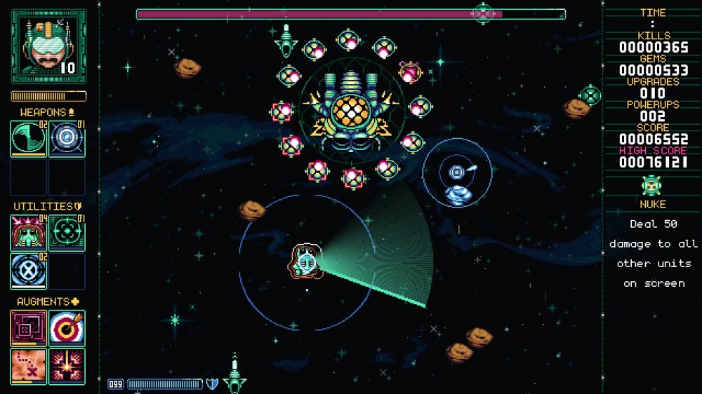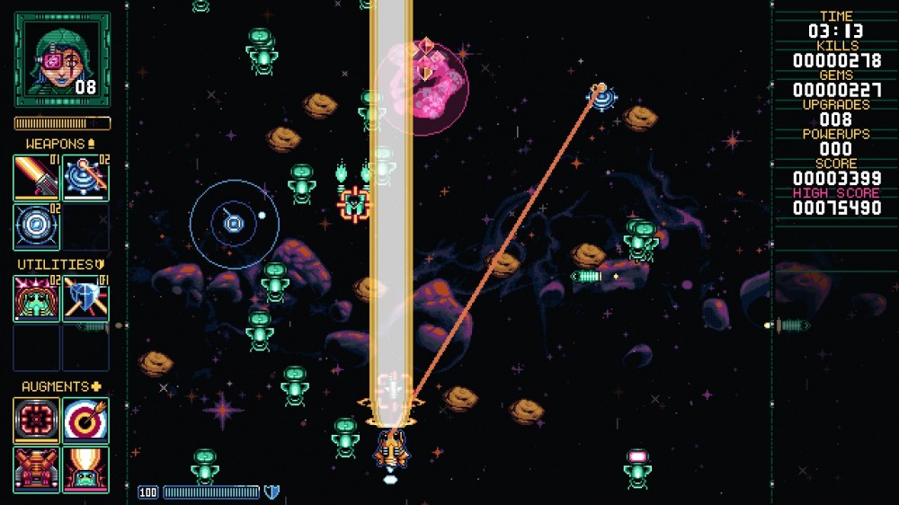 тоже. Игрок наблюдает за происходящим сверху. На выбор геймеру дают 3 пилотов. В этой видеоигре есть 5 типов бонусов, 10 ачивок, 11 разновидностей супостатов (у них есть разные вариации) и 21 вид оружия. Благодаря влиянию рандома каждый следующий забег отличается от предыдущего. Чтобы успешно пройти эту инди-игру, надо достичь трех побед над боссами. По мере прохождения открывается новый контент.