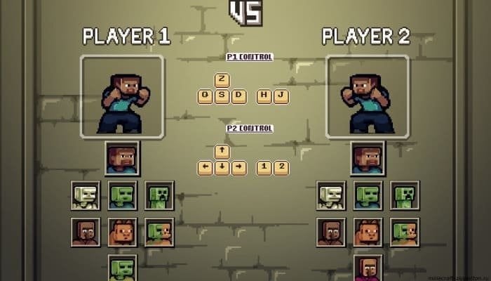В проекте присутствуют два режима – мультиплеер против живого оппонента, и одиночная кампания с искусственным интеллектом. Перед вхождением в сессию, выберите своего героя из стандартного набора: Стив из оригинальной видеоигры, крипер, Свинья, Скелет, или же Зомби. Каждому из них доступны свои предметы персонализации, в виде цветных костюмов.