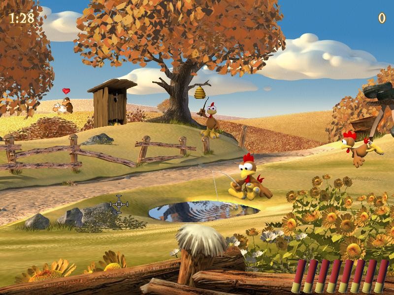Crazy Chicken: The Original – первая часть классической стрельбы по петухам. Нет настроек, выбора режима и прочего. Нажав на "Играть", пользователь переносится на стрельбище и контролирует оружие центрального персонажа. На матч выдается 1.5 минуты со сверхточным ружьем, имеющим обойму с 8 патронами. Перезарядка выполняется мгновенно, но без неё невозможно продолжить. Moorhuhn 2 – вторая часть во франшизе, где добавлены десятки модернизаций геймплея. Целей стали больше, а поле увеличилось. Теперь геймер способен стрелять по разным бонусам и предметам, появляющимся в случайных местах на карте.