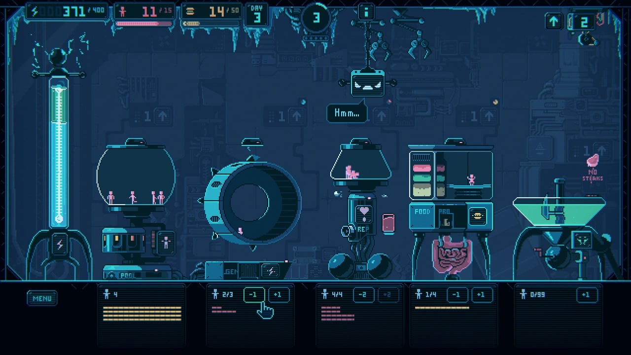 Во время прохождения Despotism 3k, игрок управляет 5ю строениями-колбами. В первом здании порабощенные человечки отдыхают. Второе строение – колесо-генератор. В следующую постройку добавляются особи мужского и женского пола, там происходит сношение и размножение. В 4й колбе изготовляется корм для рабов – гамбургеры. А последнее здание – Биореактор, где можно переработать ненужную биомассу на чистую энергию. В крайней левой части экрана показана шкала, по которой виден запас и предполагаемый расход ресурсов. Под каждым задействованным на работах питомцем отображается уровень его самочувствия, и если вовремя не отправить работника отдыхать, он умрет.