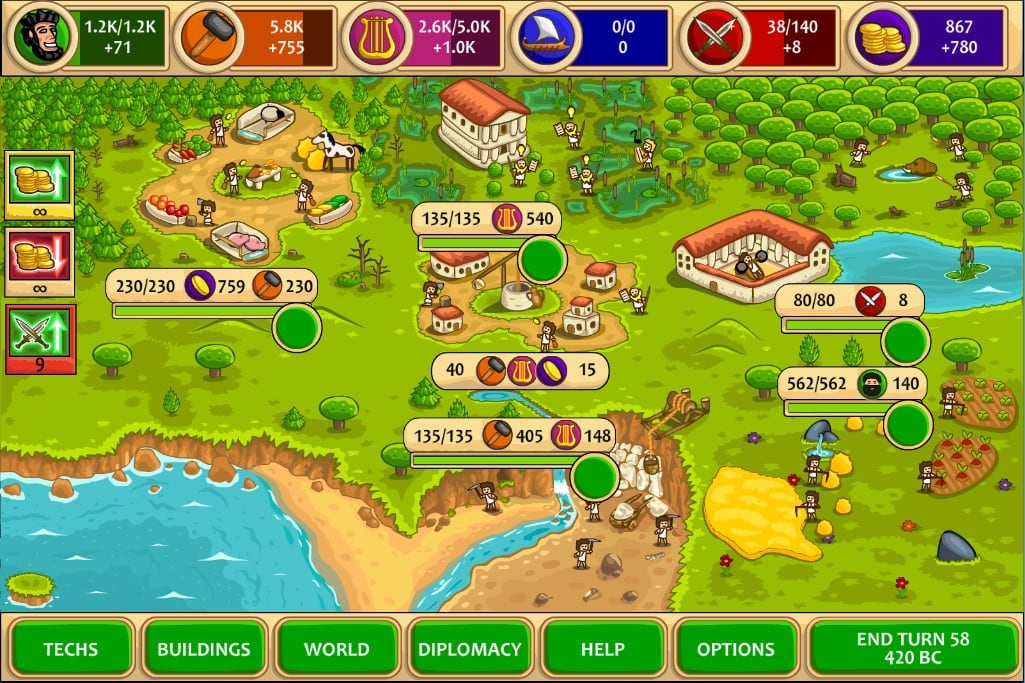 Со временем землю в Pre-Civilization Marble Age придется расширять и обогащать чем-то новым. Когда вы придете к перспективному правлению, и будете получать заветные плоды от разных отраслей, появятся завистники. Недружелюбные соседи попытаются ограбить вас и забрать все, что можно унести. Поэтому запаситесь терпением и сделайте все, чтобы варвары хорошенько поплатились и пожалели, что ступили на вашу землю.