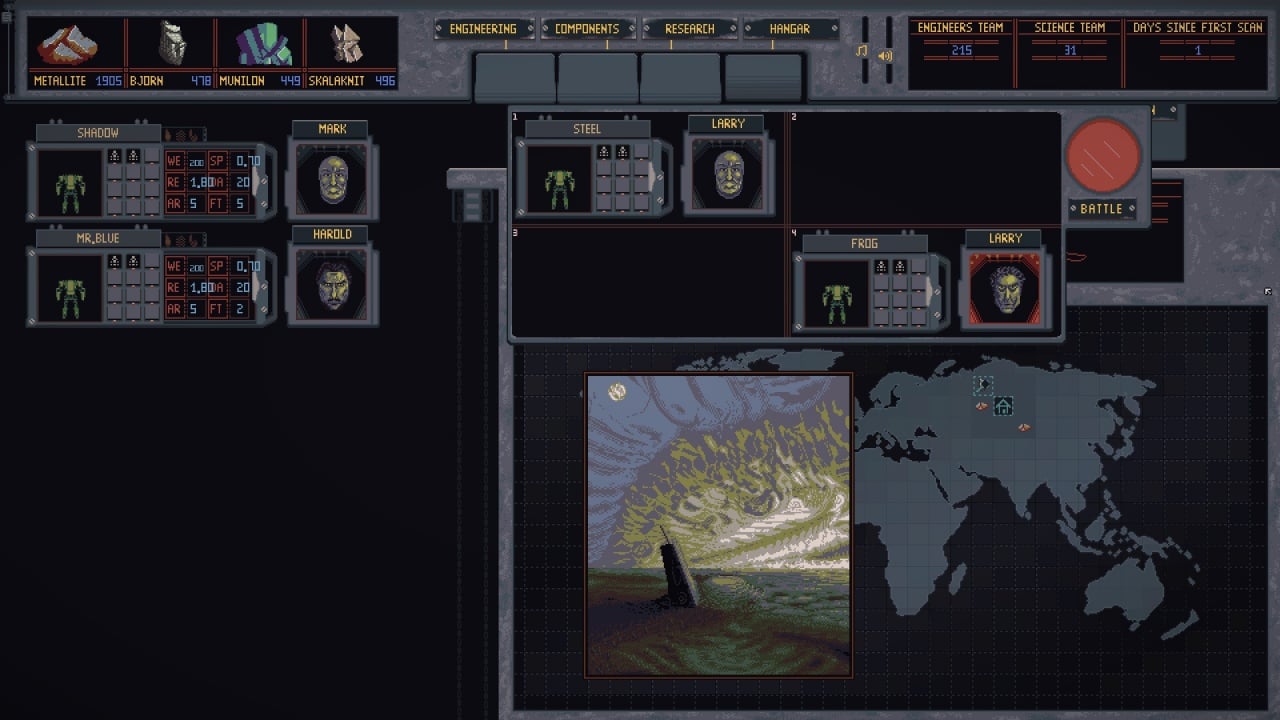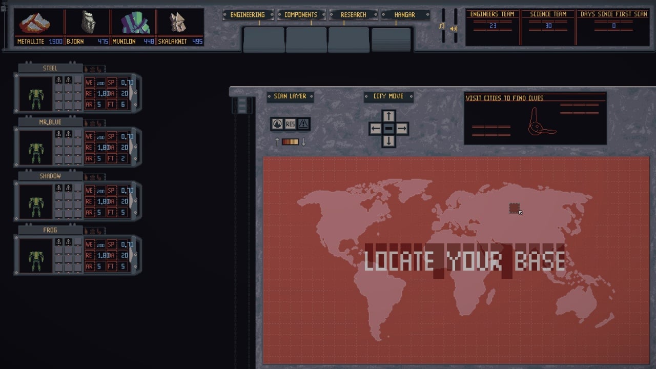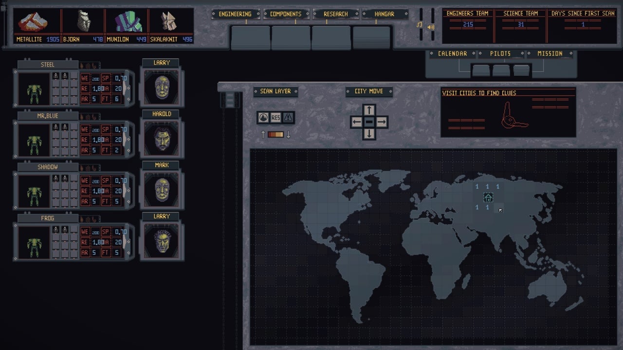 Меню ангара состоит из трех основных пунктов: календарь, пилоты и карта. Последняя показывает глобальное положение дел и распределение сил во всем мире. Пилоты - отряд элитных бойцов, управляющие техникой, а календарь показывает все события, которые ожидают в будущем, плюс ведется учет совершенных ходов и состоявшихся поединков.