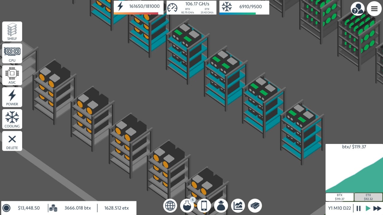 Игровой процесс стартует с создания компании и выбора расположения первой фермы, которая начнёт приносить доходы практически моментально. В дальнейшем, игрок получает возможность расширяться. Причём, делать это можно не только в рамках одного помещения. Благодаря функции рынка, геймер может подбирать подходящие залы по всему миру и развивать свою империю. Выбор страны будет влиять на погодные условия, что повлечёт за собой изменения в оплате электричества и охлаждения серверов для майнинга.