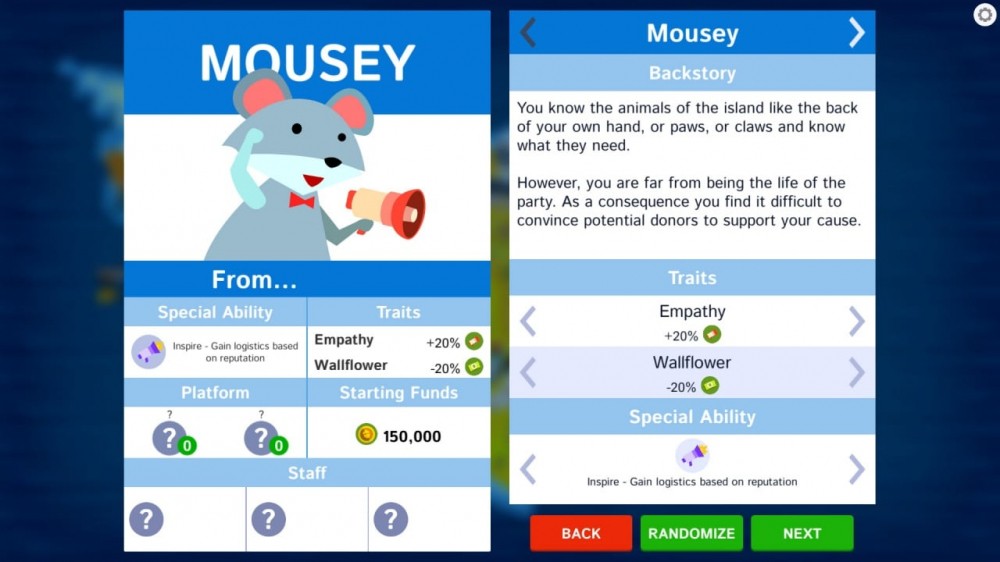 Главный герой может заручиться поддержкой народа, что даст большое преимущество над оппонентами. Для этого потребуется тратить ходы, применяя их на логистику и взаимодействие с жителями. Персонал и сотрудники помогают в решении второстепенных задач, добывают новую информацию, могут стать шпионами или советчиками. Митинга позволят собирать народ и вместе добиваться поставленных целей. Отобранные деньги у богатых позволят потратить их на улучшении рекламы для себя и многие другие полезности.