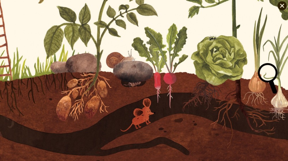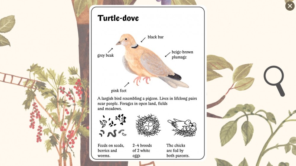 Когда персонаж оказывается возле точки интереса, появляется иконка с маленькой лупой. Если на неё нажать, то на экране всплывет карточка. На ней изображен реалистичный рисунок конкретного существа или растения. А под ним находится текстовая информация о животных, насекомых, овощах или фруктах. Она кратко рассказывает о самом объекте и его главных особенностях, а также о рационе и месте обитания. К примеру, если юзер клацнет на бабочку, то узнает, что перед ним капустница, поймет строение её тела, будет знать, что она питается цветочным нектаром. Всего в инди-проекте есть 160 представителей флоры и фауны. Сам тайтл короткий. Он проходится за 2-3 часа.