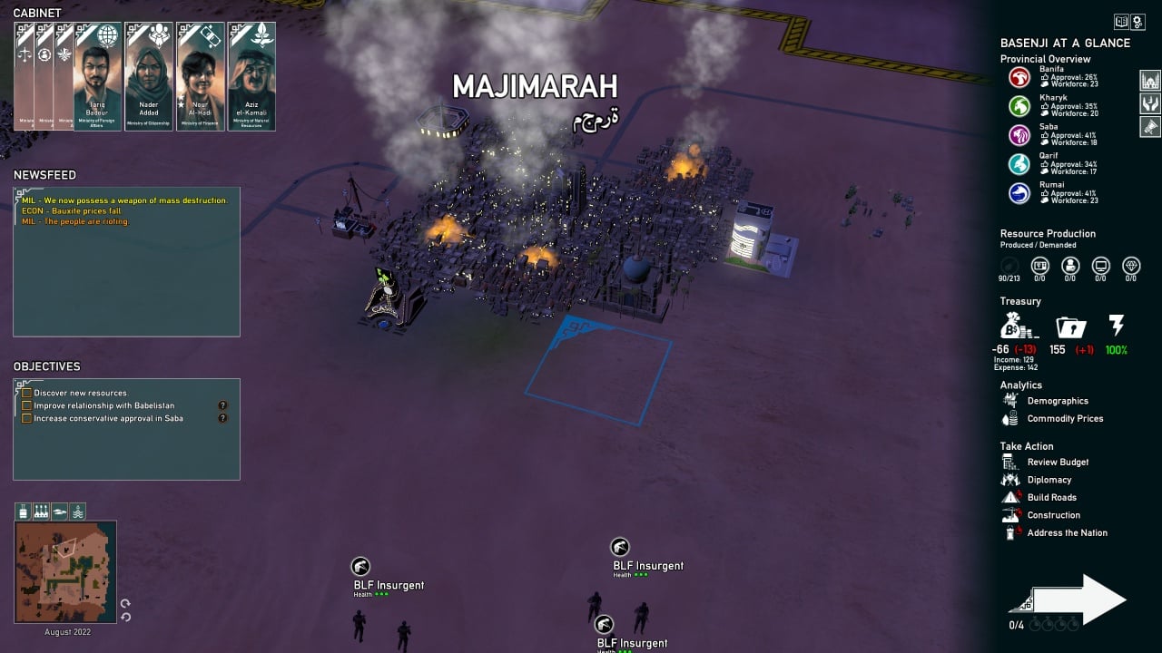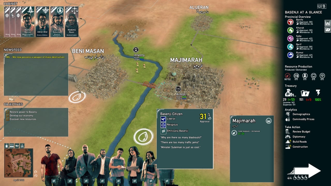 Помимо строительства и развития инфраструктуры, геймеру предстоит заниматься политической жизнью, нанимая людей, трудящихся на благо нации в Кабинете Министров. Основная проблема – игрок не осведомлён, кто из этих чиновников окажется предателем, тайно работающим против существующей власти ради интересов третьих лиц. Существуют несколько механик вычисления шпионов, с помощью которых можно удержаться в президентском кресле подольше.