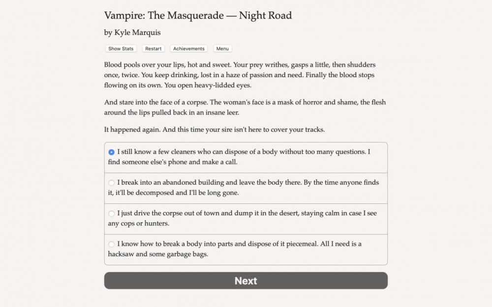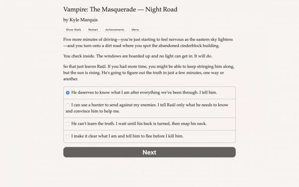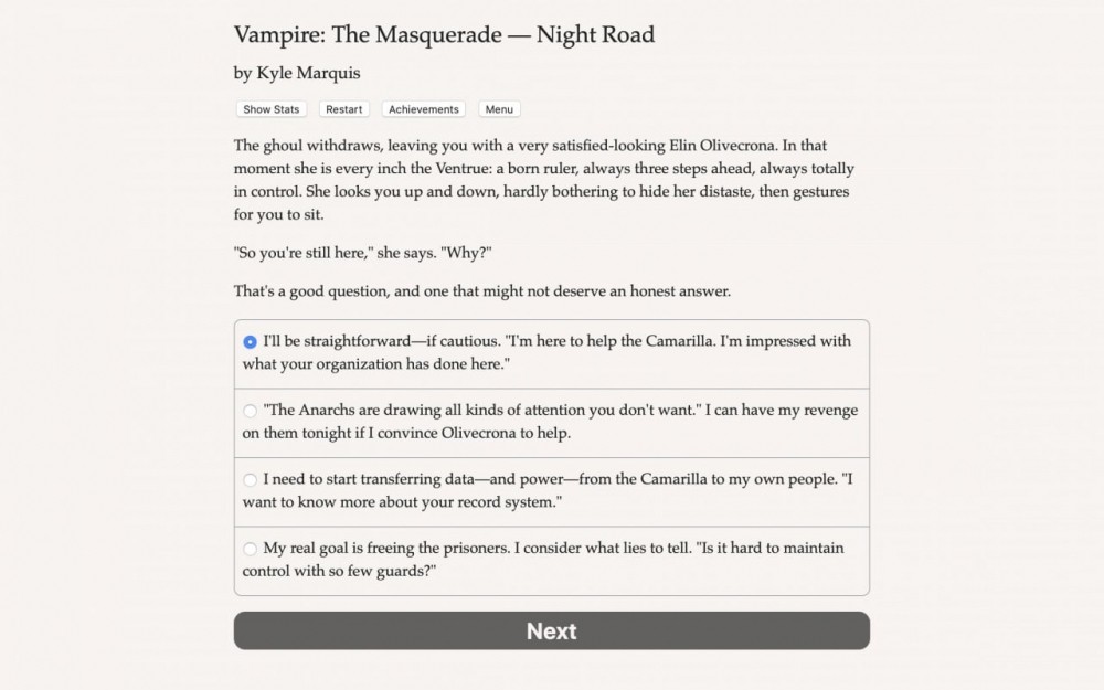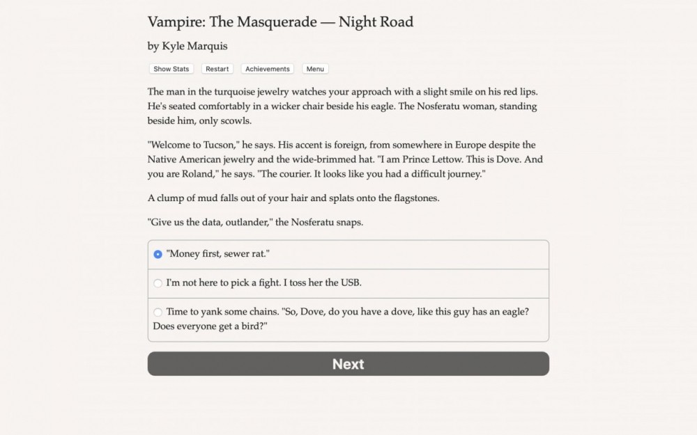 Перед началом игровой сессии дают создать героя. Можно выбрать ему пол, клан, сира, род деятельности до и после обращения в кровопийцу. Геймплей состоит из чтения большого количества текста и постоянного выбора реплики или действия. Все они влекут за собой те или иные последствия. Часто для совершения конкретного поступка нужно пройти проверку соответствующего умения. К примеру, для успешного запугивания NPC необходимо обладать прокачанным навыком манипуляции. Сделать из героя мастера на все руки не получится, поэтому придется вдумчиво распределять очки опыта.