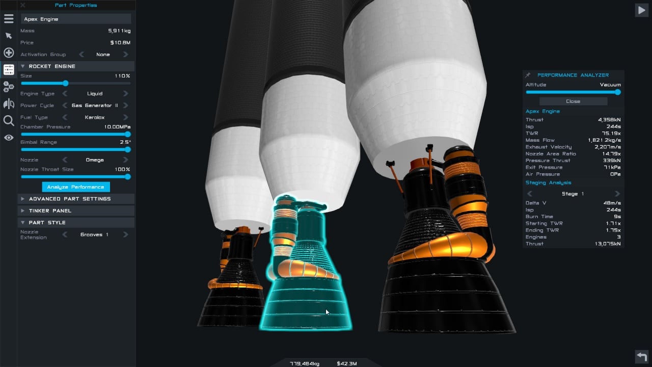 Для создания уникальной ракеты доступны несколько десятков деталей – звучит не сильно много, однако каждую из них можно настраивать как угодно. Меняется абсолютно все – начиная от формы и заканчивая плавучестью и цветом. К примеру, всего предусмотрено несколько типов двигателей. Но в этих камерах сгорания настраивается вид топлива, форма сопла и размер – в результате на выходе получается сотни комбинаций, и каждая из них ведет себя абсолютно по-разному. При неправильной настройке ракета может пролететь километр и с треском разбиться. Если же действовать правильно, то носитель способен долететь до конца галактики, что вознаградиться новыми красивыми видами.