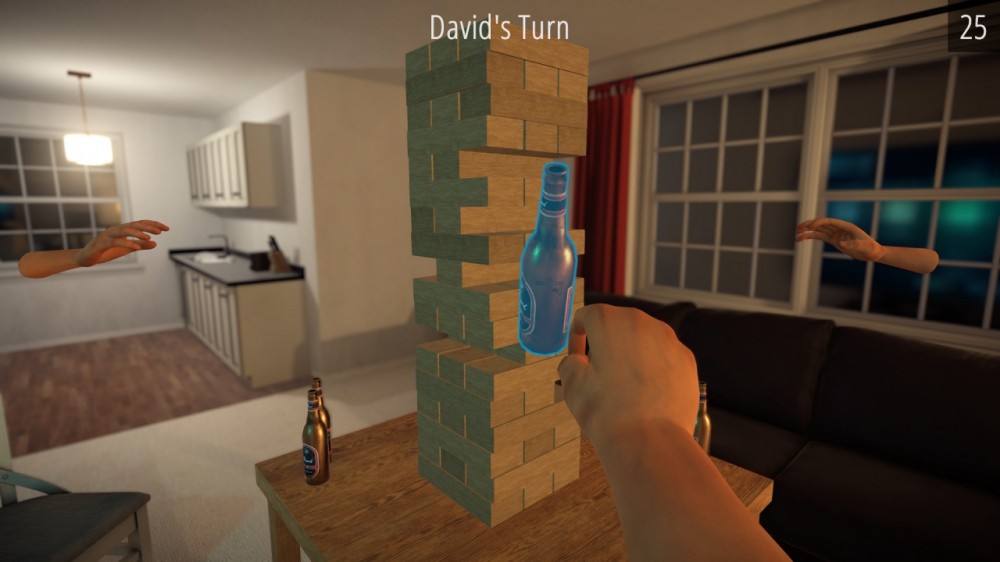 Рядом стоит бутылка пива. Если выпить алкоголь, экран начинает плыть, а координация героя постепенно шалит. Получается, что осуществить поставленную задачу не так просто, как кажется на первый взгляд! Тем более, никто не запрещает устроить дебош, напасть на напарников и просто страдать всякой ерундой, развлекаясь в большой интерактивной комнате.