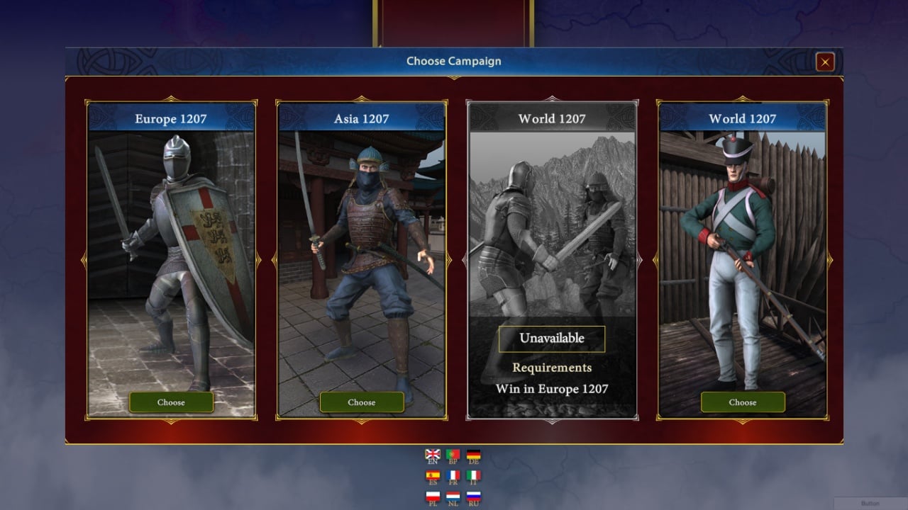 Базовая версия без сторонних модификаций обладает датой старта 1207 год нашей эры. Разработчики объяснили такой выбор тем, что в этот период одновременно было множество значимых конфликтов, таких как нападение монгольского иго и их стычки с Русью и азиатскими державами, доминирование Священной Римской Империи и её постоянные войны по нескольким фронтам одновременно, сражения на территории современной Великой Британии и тому подобное. Геймеру доступно на выбор больше 80 фракций, обладающие своими отличиями, положительными и негативными моментами, из-за чего геймплей на них ощущается по-разному.