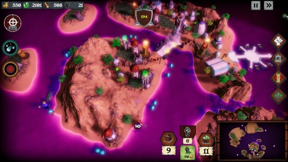 Позволяется задать один из трех режимов сложности. На хардкоре враги действуют агрессивнее и их становится значительно больше, из-за чего действовать потребуется в несколько раз быстрее и продуманнее, ведь каждая ошибка может стоить жизни. Необходимо любой ценой защищать свою базу. Враги представляют собой могущественных элементалей. Управляя гражданами, собирая ресурсы и выставляя турели, можно эффективно защититься от противников. Особую роль играют магические силы, такие как Метео и Проклятие. Однако для их использования необходимо мана.