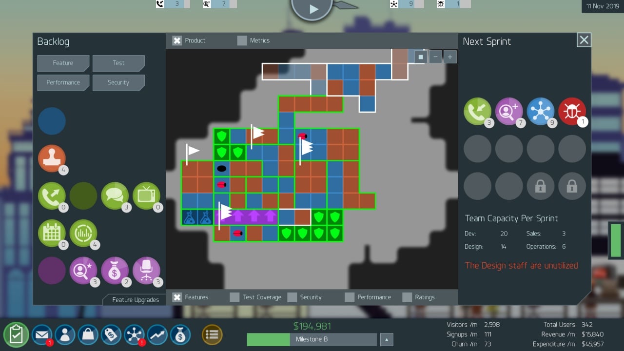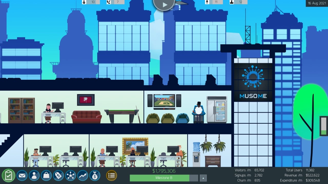 Геймер получает в своё распоряжение просторный офис, который нужно развивать, обустраивать мебелью и расширять в процессе прохождения для увеличения рабочих мест и общей привлекательности. Большое внимание сделано на сервера и компьютеры, используемые для вычислительных действий. Коллектив, помогающий держать на плаву компанию, набирается по их характеристикам, поделённым на 4 группы: дизайнерские навыки, технические, операционные и торговые. Каждый специалист выполняет свои обязанности по специальности. Это условие для наиболее качественной работы отделов. Также, игроку необходимо будет заняться привлечением сторонних инвесторов для повышения финансирования, прорабатывать выгодную цену на выпускаемый продукт, и заниматься подбором правильных каналов продаж для нахождения клиента, готового платить.