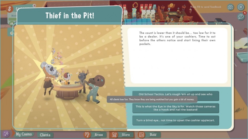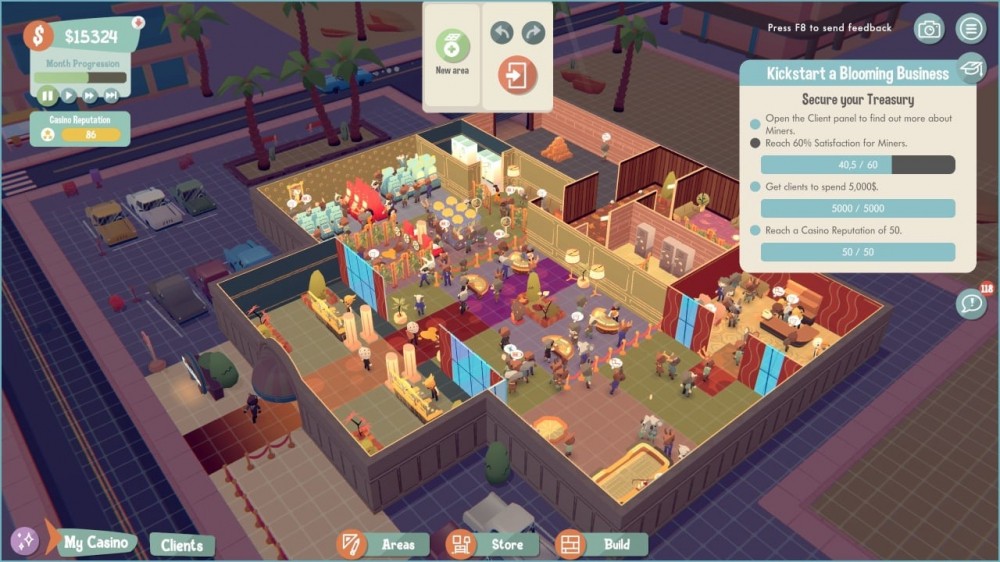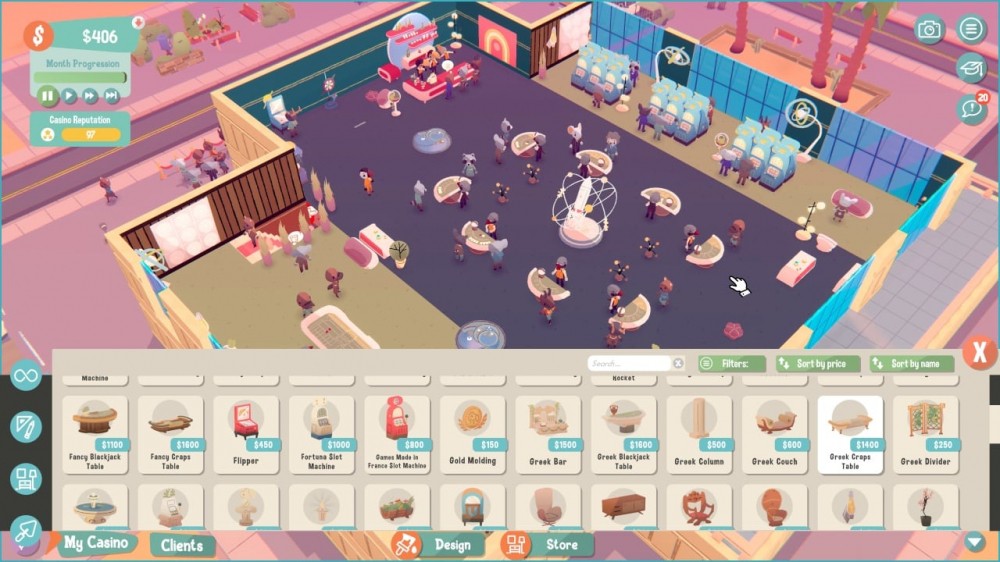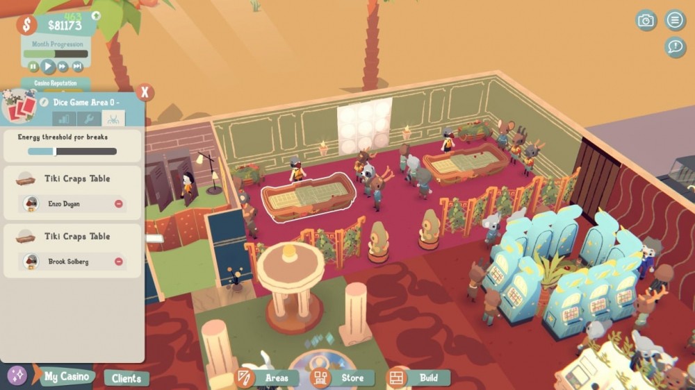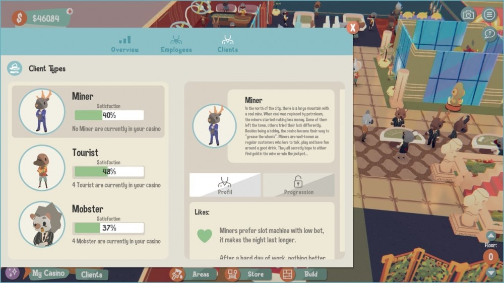 Для привлечения большего количества гостей необходимо учитывать пожелания клиентов, создавая комфортные условия для азартных игр. Пользователи будут заниматься рекламой, дизайном помещений и беседами с разными фракциями-конкурентами, что желают захватить казино. Придется заключать сделки, обустраивать внутреннее убранство и расставлять желаемые виды азартных развлечений в комнате. Для процветания бизнеса, важно успокаивать пьяных посетителей и делать счастливыми игроманов, прислушиваясь к их потребностям.