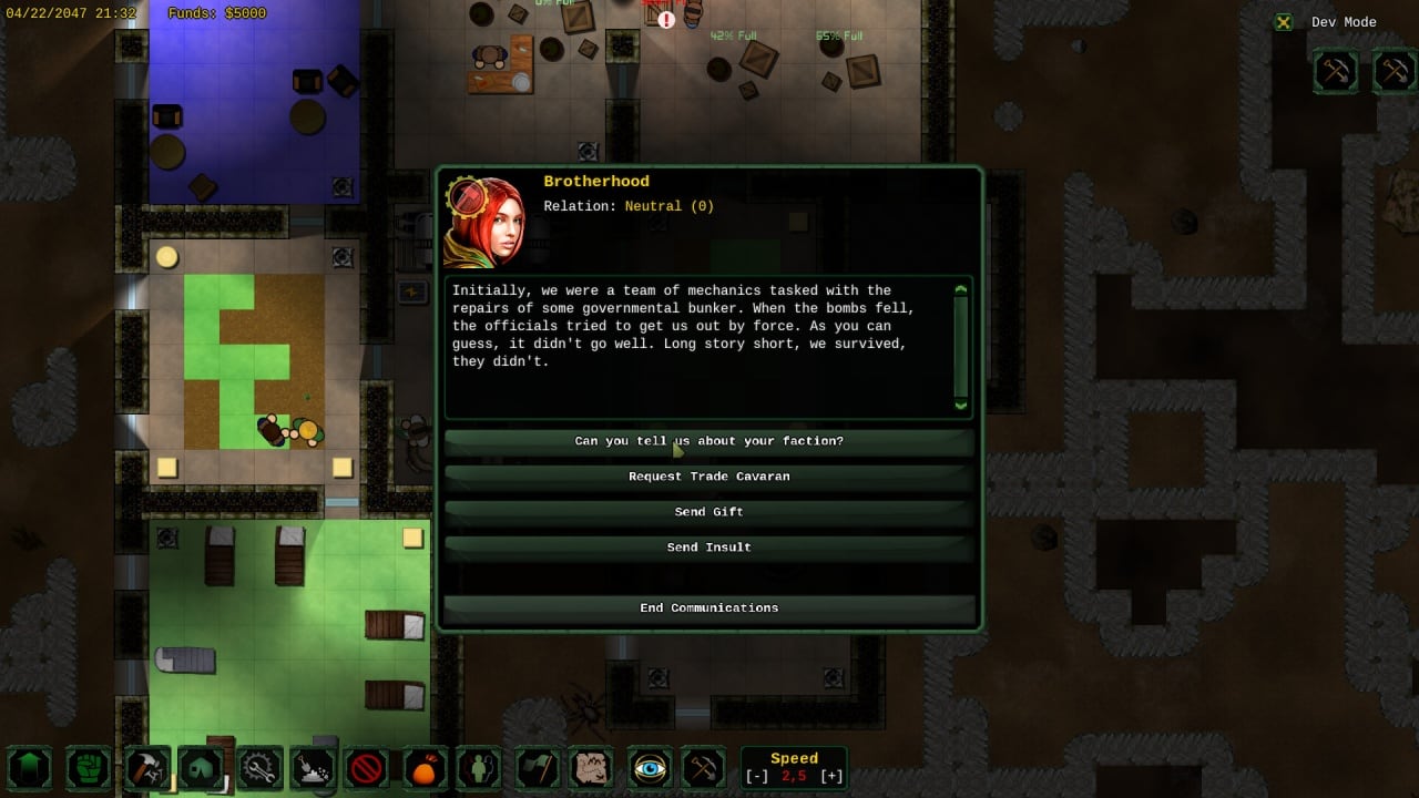 Окружающая среда, в которой происходит процесс постройки безопасной территории, рандомно генерируется после каждого старта новой игры, что позволяет сделать прохождение уникальным. Благодаря возможности изучать технологии, городишка получает доступ к механизмам как для защиты территории, так и для атаки на близлежащие лагеря врагов с целью получения выгоды в виде дорогого лута, который можно использовать во благо свой базы или продать. Также, при наличии нужного количества ресурсов, игрок открывает доступ к постройке укреплений под землей, что значительно повышает безопасность проживающих, ведь бункер сложнее штурмовать.