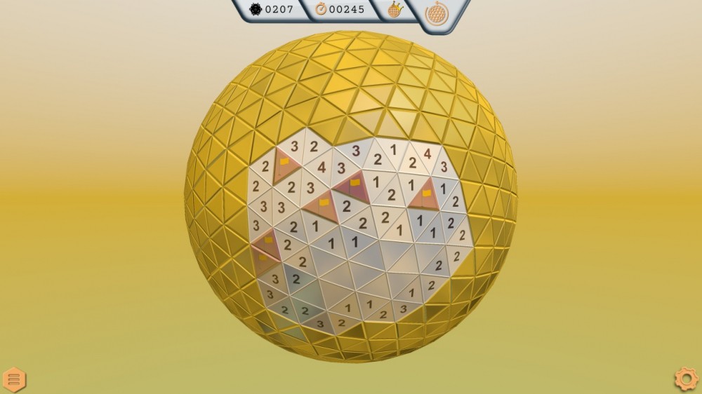 Режимов тут два. Традиционный вариант предлагает классический игровой процесс, а его облегченный аналог убирает необходимость угадывать и предлагает решать загадки только с помощью математики и логики. В наличии 4 уровня сложности. Можно выбирать из 5 размеров небесных тел. Самый крошечный глобус состоит всего из 92 плиток, а наиболее крупный – из 20480. От этой площади зависит и продолжительность сессий. Маленькую карту можно одолеть за пару минут, а на прохождение гигантского этапа может уйти несколько часов. По мере прохождения открываются планетарные скины. Всего тут 14 тем: земная, марсианская, золотая, рубиновая, изумрудная, сапфировая и так далее. Также здесь есть таблица лидеров.
